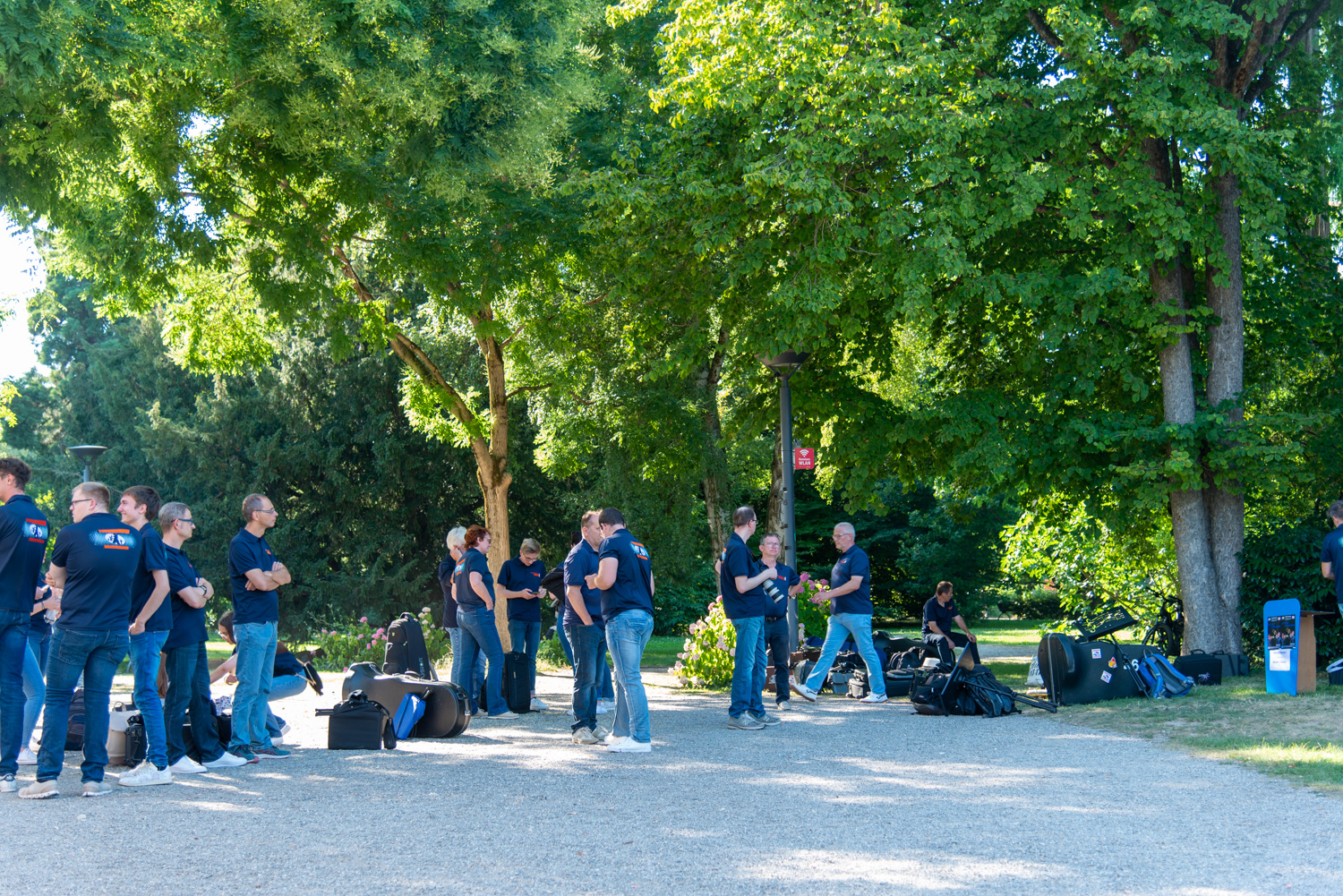 Am Samstag 16. Juli 2022 ging es in aller Frühe (zumindest ware es für einige Musiker sehr früh) mit dem Bus nach Friedrichshafen und mit dem Katamaran weiter nach Konstanz. In Konstanz angekommen konnten wir uns in der Hafenhalle im Biergarten stärken. Ausgeruht ging es dann zur Konzertmuschel für eine kurze Einspielprobe und um die Musikkameraden des Musikvereins Konstanz-Wollmatingen zu Treffen.
